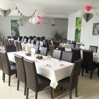 Der Saal bietet Platz für 100 Personen, die alte "Kneipe", mit ihrem Dielenboden und den tiefen Decken, laden zum verweilen ein.